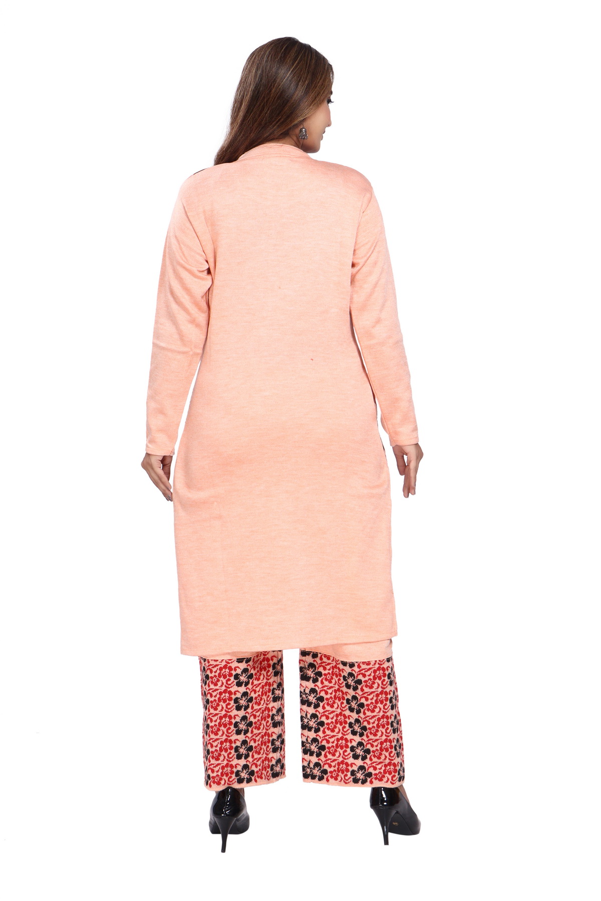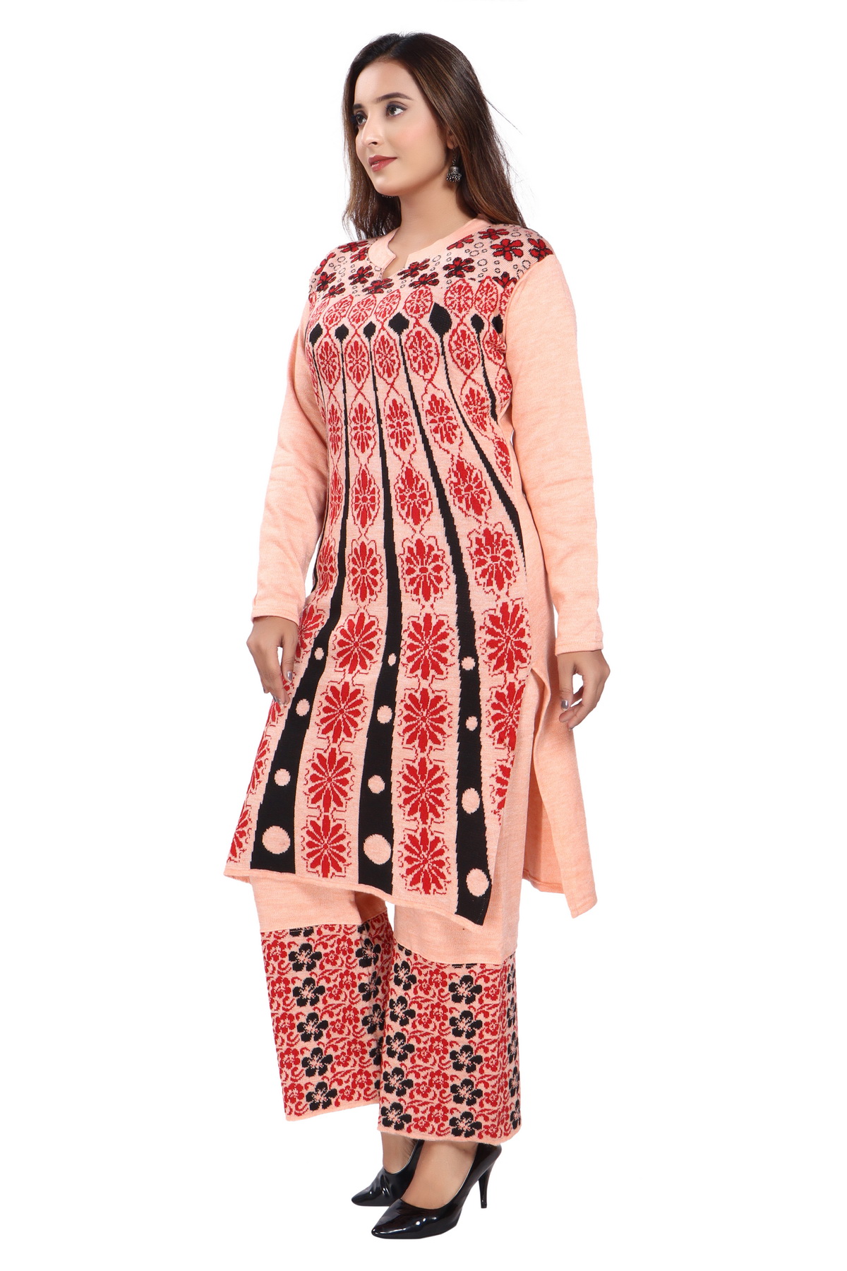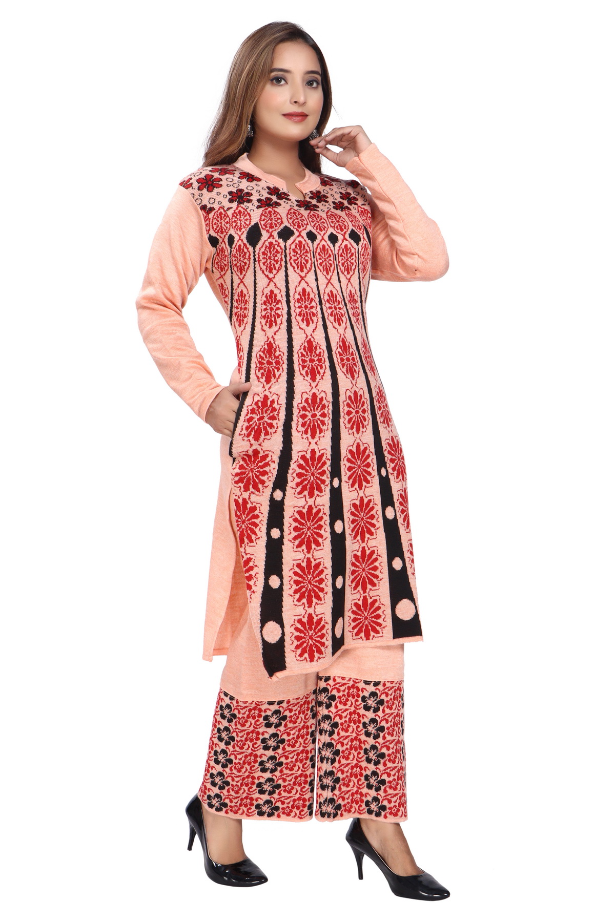 Elevate your winter wardrobe with this beautifully designed winter co-ord set, featuring a warm and stylish kurti paired with matching palazzo pants. Crafted with premium wool-blend fabric, this set is designed to provide optimal warmth while maintaining a lightweight and comfortable fit. The co-ord set seamlessly blends elegance and practicality, making it ideal for a variety of occasions, from casual outings to formal gatherings.